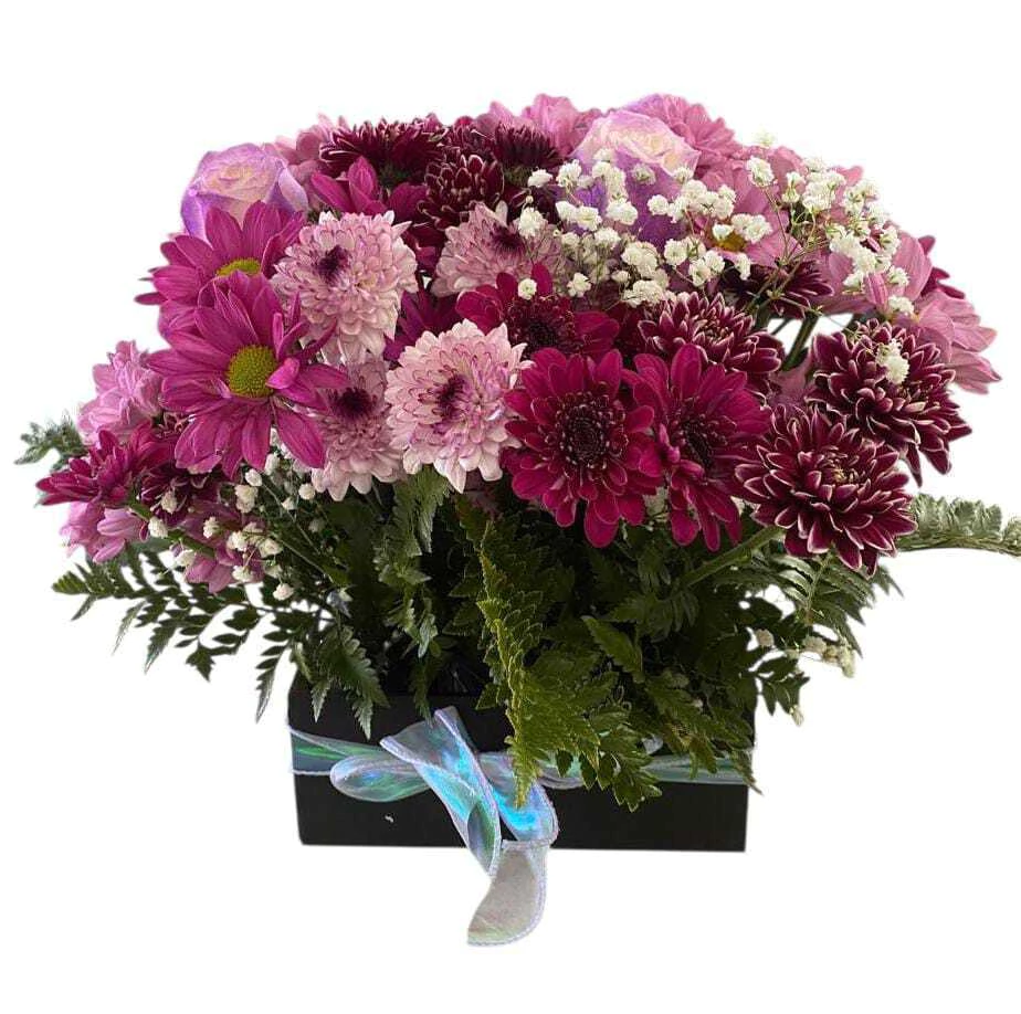 Una delicada caja que guarda rosas y margaritas en tonos lila, un detalle lleno de elegancia y ternura.